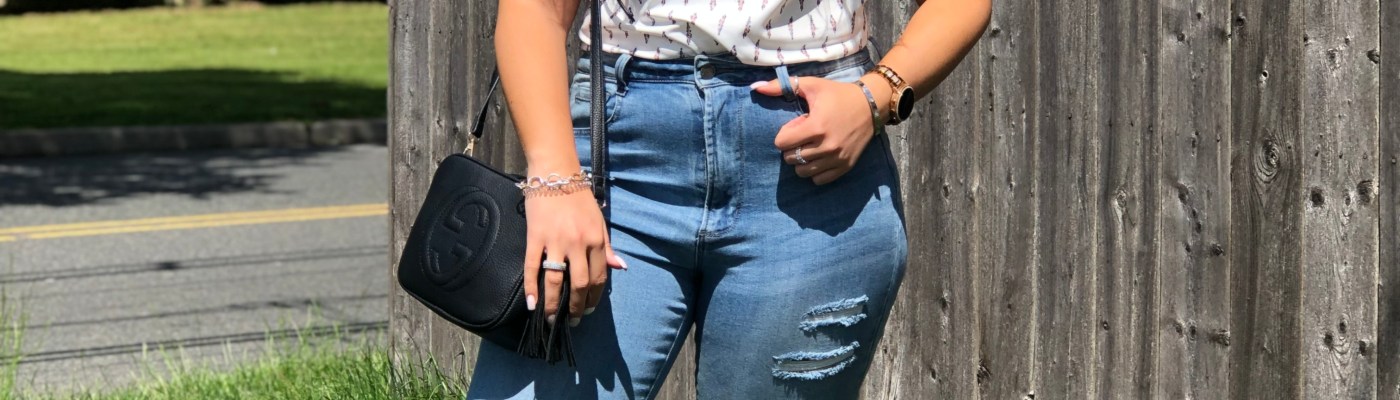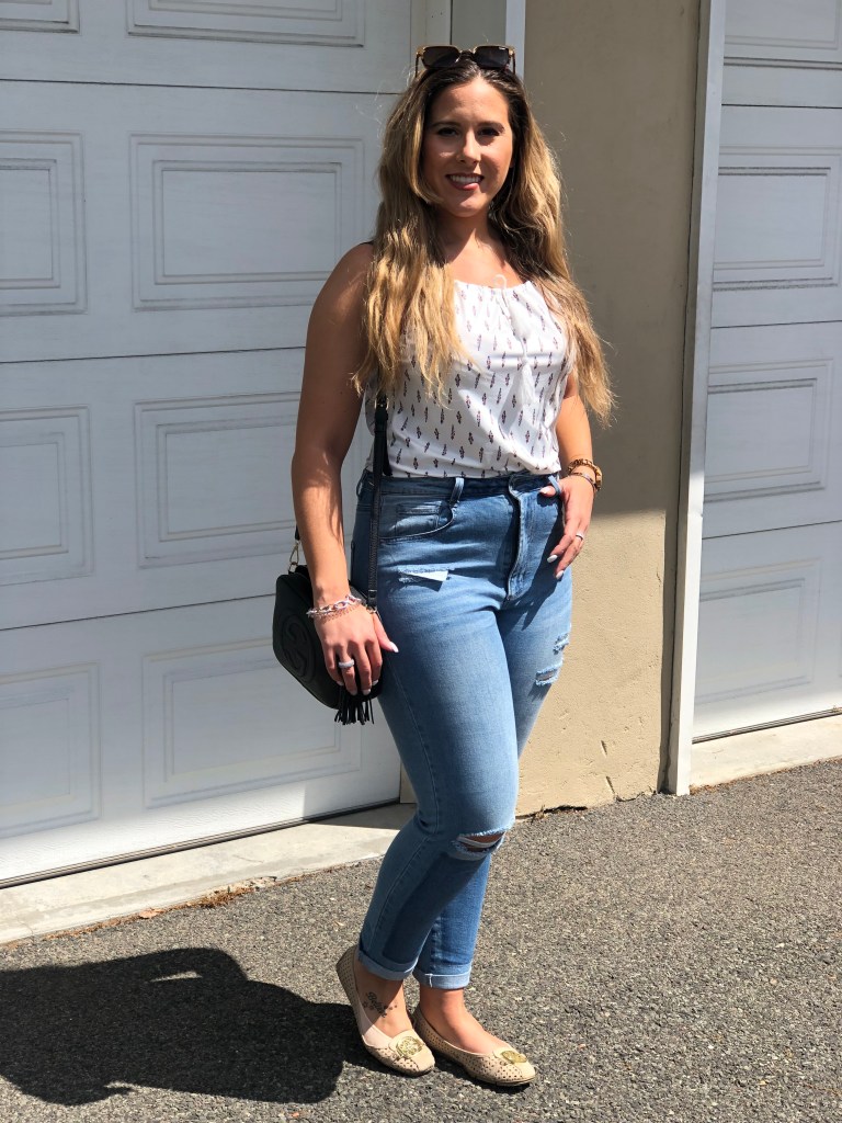 I love how they have little rips and holes in them, honestly, I love ripped jeans, but these aren’t too ripped where they start to look messy and sloppy! These are super cute! They also have a different wash on the front part of the calf, like a patchwork, but it is just a darker part of the jeans! They just add some dimension and texture to the jeans. The jeans also roll up at the bottom which is so good for me. I’m 5’5” and a lot of jeans are too long for me, but these hit at the perfect spot! Wear them with heels, flats or pumps and you’re good to go!