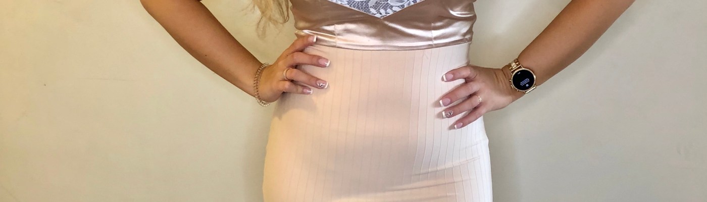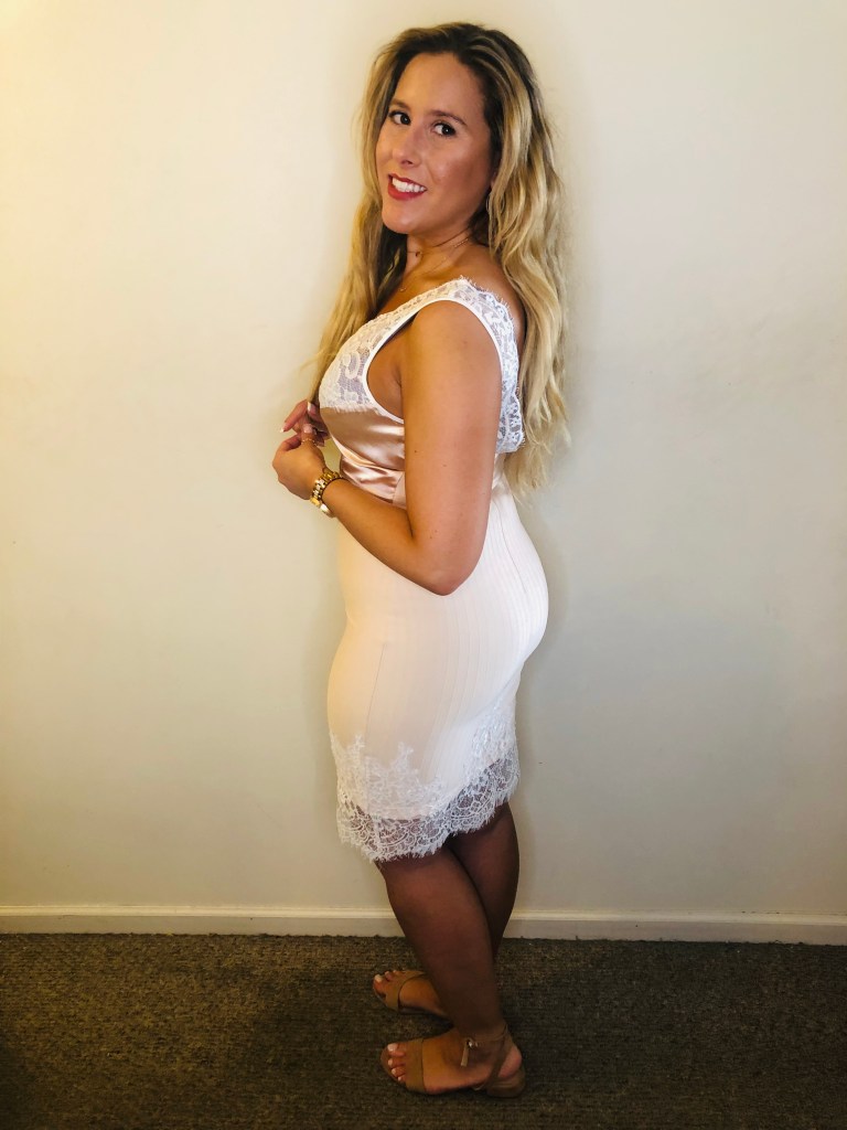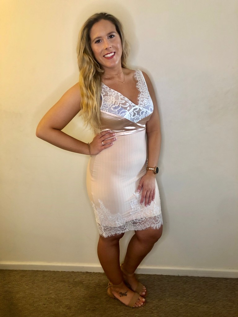 The color of the dress is taupe, with some blush satin. It also has a gorgeous white sheer lace bodice. The front is a little low, but nothing too revealing. The back though has a beautiful plunging neckline, but not to worry, you can still wear a bra! The zipper in the back is hidden, and this dress is not lined, but not to worry, it is not see through. It is made of polyester with a little spandex. The material is just so comfortable. You know how sometimes, fitted dresses can be too unrealistic to wear all night long? Not this one!