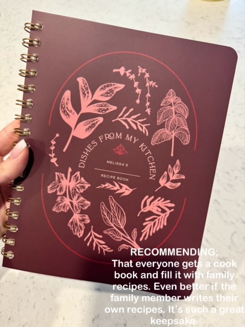 Then fill it with family recipes, ever better if that family member can write the recipe in themselves. I actually got some great recipes from my grandma, and I am looking to get my mom to write some in too (mom if you’re reading it’s coming your way). The one I have breaks down, breakfast, lunch, dinner, and treats and each section has a page at the beginning where you can put the dishes name. Truly it makes such a great gift to pass on for generations which can hold some family staples
